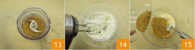 y añadid también la nata montada poco a poco 16. Obtenida una mezcla homogénea, vertedla dentro de un molde de 19x9 cm 17, nivelad la superficie 18 y colocadla en el congelador por al menos 12 horas.