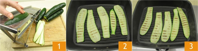 Para preparar la parmigiana blanca de calabacines, comienza cortando los calabacines en rodajas de 2-3 mm de grosor ayudándote con una mandolina 1. Calienta una parrilla, coloca los calabacines 2 y ásalos por ambos lados durante unos minutos 3, teniendo cuidado de no romperlos. Luego reserva.
