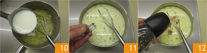 En este punto añade la leche 10 y diluye todo el compuesto, mezclando bien con las varillas. Sigue mezclando, cocina el compuesto a fuego bajo hasta que se espese, sazona con sal, nuez moscada 11 y pimienta 12.