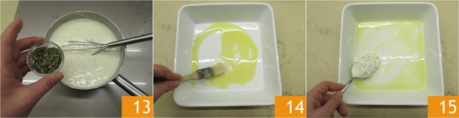 Al final de la cocción añade el romero picado 13 y reserva. Ahora toma una fuente de unos 20 cm y úntala con aceite de oliva virgen extra por toda su superficie 14. Extiende una capa de bechamel 15