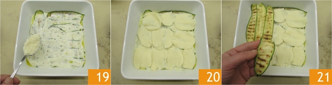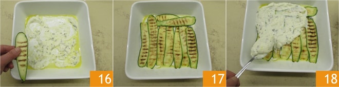 y comienza a disponer las rodajas de calabacín a la parrilla como en la foto 1617. Espolvorea con más bechamel 18