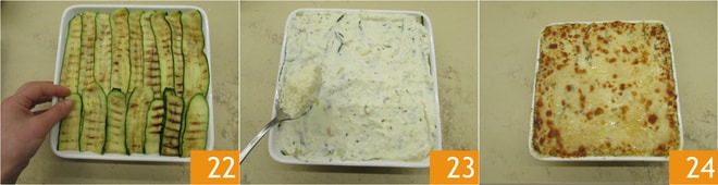 Termina con la última capa de calabacines 22, una capa de bechamel y una última generosa cantidad de Grana 23. Hornea en horno precalentado a 180° durante unos 30 minutos, hasta que aparezca una bonita costra dorada en la superficie. Deja reposar 15 minutos antes de cortar tu parmigiana blanca de calabacines 24.