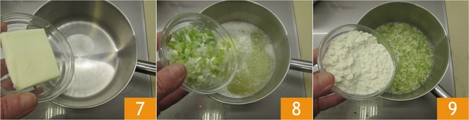 En otro cazo, derrite la mantequilla 8 y añade la cebolleta picada 8, que deberá dorarse. Añade la harina en forma de lluvia 9, mezclando con unas varillas para obtener un roux bien amalgamado.