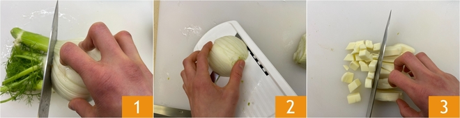 Para preparar la parmigiana de hinojos, comienza limpiando los hinojos: elimina la parte verde 1 y divídelos por la mitad, luego córtalos finamente con la mandolina para obtener rodajas muy finas y regulares 2. Corta el provolone primero en rodajas y luego en cubos 3.<\/p>