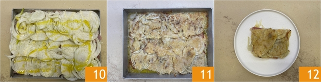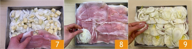 Añade los cubos de provolone 7 y cubre con las lonchas de jamón cocido formando una capa compacta 8. Continúa con una segunda capa de hinojos, luego completa con más queso rallado 9.<\/p>