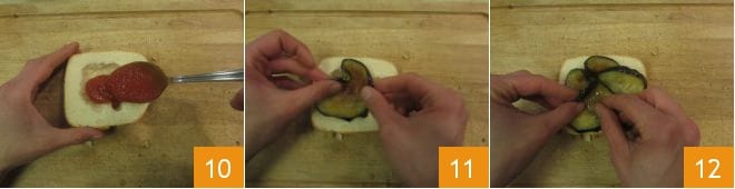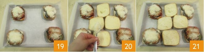 Haz que sólo se doren pero no se quemen el pan 22. Luego vuelve a unir las respectivas tapas con las mitades rellenas 23 y tu parmigiana en el bocadillo está lista para ser servida 24.