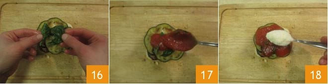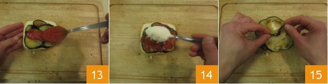 Continúa con un poco de salsa 13, una cucharada de Parmigiano 14 y luego otras dos rodajas de berenjena 15.