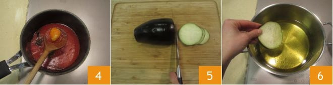 Deja que se espese, de vez en cuando remueve y asegúrate de que no se queme. Al final de la cocción retira el ajo y ajusta de sal a tu gusto 4. Mientras tanto, ocúpate de las berenjenas: después de lavarlas y secarlas, córtalas en rodajas de 2-3 mm de grosor para obtener exactamente 20 rodajas 5. En un cazo calienta abundante aceite de semillas y cuando esté a 170° (te recomendamos monitorizar la temperatura con un termómetro) sumerge pocos trozos a la vez 6.