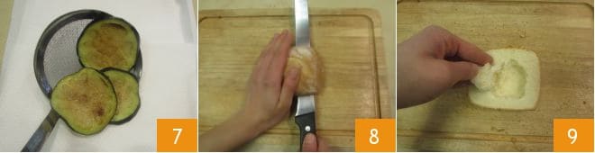 Una vez doradas, tardarán 1-2 minutos, escurre las rodajas sobre papel absorbente 7. Cuando hayas terminado ocúpate del pan: corta los panes por la mitad con un cuchillo de sierra 8, luego reserva la tapa, mientras vacías el interior de la base de buena parte de la miga 9.