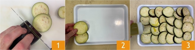 Para preparar la parmigiana de berenjenas en freidora de aire, primero corta las berenjenas en rodajas con un grosor de aproximadamente 1 cm 1. Coloca las rodajas en una bandeja 2 y rocía con un poco de aceite 3.