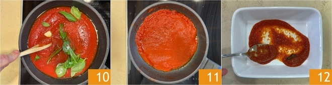 Sala, añade pimienta y cocina a fuego medio durante unos 20 minutos, mezclando de vez en cuando 10. Cuando la salsa de tomate esté lista 11 y las berenjenas cocidas, puedes montar tu parmigiana: toma una fuente de 20x15 cm y cubre el fondo con un poco de salsa 12.
