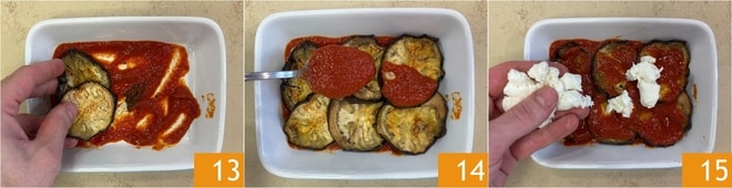 Coloca las rodajas de berenjenas superponiéndolas ligeramente 13, luego cubre con abundante salsa 14 y distribuye la mozzarella troceada 15.