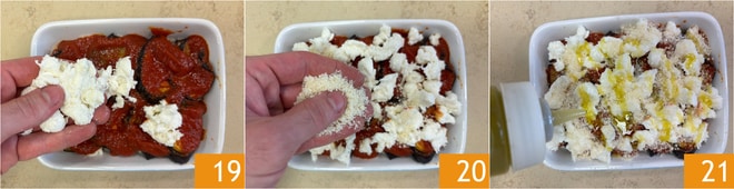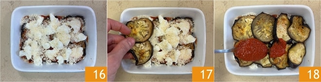 Espolvorea con el Parmigiano Reggiano rallado 16 y continúa repitiendo las capas en el mismo orden: primero berenjenas 17 y salsa de tomate 18.