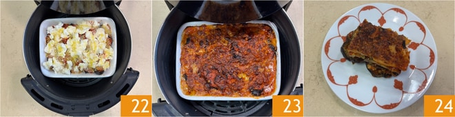 Transfiere la fuente a la cesta de la freidora y cocina durante 15 minutos a 190° 22. Una vez cocida 23, deja reposar la parmigiana en freidora de aire durante unos minutos antes de cortarla y servirla 24!
