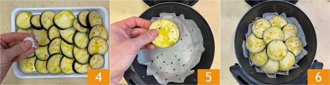 Añade también la sal 4 y la pimienta, luego transfiere las berenjenas dentro de la cesta de la freidora de aire (nosotros hemos utilizado una freidora con capacidad de 6 litros) 5. Cocina a 200° durante 8 minutos 6.
