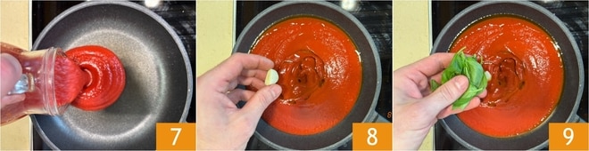 Mientras tanto, prepara la salsa de tomate: vierte el puré en una sartén 7, luego sazona con un poco de aceite, un diente de ajo 8 y algunas hojas de albahaca 9.