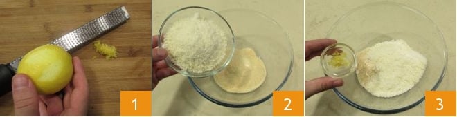 Para preparar los passatelli con ragú de manzanas, comienza poniendo a fuego un buen Caldo de carne (también puedes hacer un caldo vegetal si lo prefieres, obtendrás un sabor más delicado). Mientras se cuece, dedícate a la masa de los passatelli: ralla la cáscara de limón 1, teniendo cuidado de no llevarte también la parte blanca que es amarga, y resérvala. En un recipiente, vierte el pan rallado y el parmesano rallado 2, añade también la cáscara de limón 3,