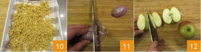 A medida que los formes, colócalos sobre una bandejita cubierta con un paño ligeramente enharinado 10. Reserva los passatelli y ocúpate del ragú de manzanas: limpia y pica una chalota 11, lava y seca las manzanas, luego córtalas en cuartos 12