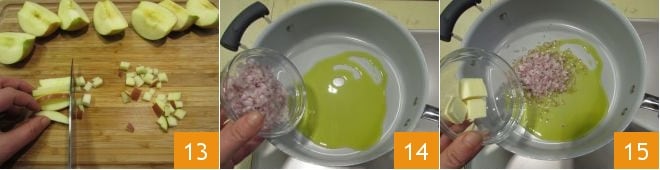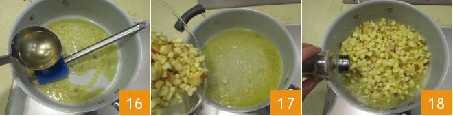 Pon a pochar la chalota a fuego bajo durante 4-5 minutos, luego añade un cucharón de caldo 16, vierte las manzanas en cubos 17, salpimienta 18 y cocina durante 10 minutos a fuego bajo.