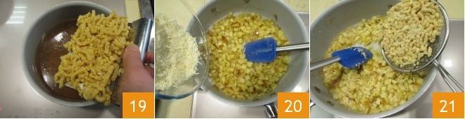 Mientras tanto, lleva el caldo de carne a ebullición y añade los passatelli 19 cocina hasta que suban a la superficie, tomará pocos minutos. Mientras tanto, el ragú estará listo, apaga el fuego y sazona con la mitad de la dosis de queso de Fossa rallado 20. Escurre los passatelli con una espumadera directamente en la cazuela con el ragú de manzanas 21.