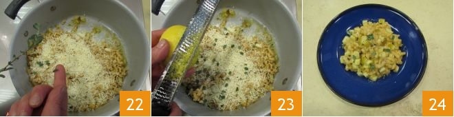 Sazona nuevamente con el queso de Fossa restante, las hojitas de mejorana 22 y la cáscara rallada del limón 23 y sirve bien calientes los passatelli con ragú de manzanas 24.