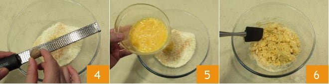 aromatiza con la nuez moscada rallada 4 y finalmente vierte los huevos batidos junto con una pizca de sal 5. Mezcla los ingredientes ayudándote con una espátula 6, o a mano si lo prefieres,