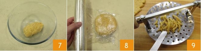 y trabaja hasta obtener un bloque elástico y compacto 7. Si resulta demasiado seco, añade muy poco caldo, de lo contrario, si está demasiado blando, un poco más de pan rallado. Envuelve el bloque en film transparente dejándolo reposar al menos 2 horas a temperatura ambiente 8. Esto servirá para hacer la mezcla más compacta y evitar que los passatelli se deshagan durante la cocción. Transcurrido este tiempo, quita el film del bloque y colócalo sobre la superficie de trabajo ligeramente enharinada, espolvorea también la superficie con un poco de harina y luego forma los passatelli ayudándote con el típico hierro. Para obtenerlos, debes presionar y arrastrar al mismo tiempo, de esta forma la masa alargada saldrá por los agujeros. Luego, sepáralos ayudándote con una cuchilla y córtalos en trozos de 4 cm de largo 9.