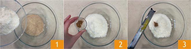 Para preparar los passatelli en caldo, primero preparad el Caldo de carne siguiendo nuestra receta. Mientras tanto, dedícate a la masa de los passatelli: en un bol grande, verted el pan rallado y el Parmigiano Reggiano rallado 1. Aromatizad con la nuez moscada 2 y la corteza de limón rallada 3.