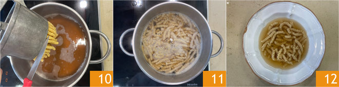 Continuad amasando con las manos 7 y trabajad durante mucho tiempo hasta obtener una bola sólida y elástica. Cubrid el bol con film transparente y deja reposar en el frigorífico durante unos 15-30 minutos 8. Pasado este tiempo, llevad el caldo a un ligero hervor e insertad una porción de masa a la vez en un prensapatatas con agujeros de al menos 5 mm de ancho 9.