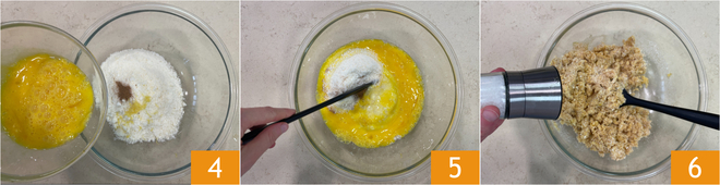 Batid los huevos aparte y añadidlos a la mezcla 4. Mezclad los ingredientes con un tenedor 5, luego ajustad de sal 6.