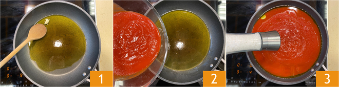 Para preparar la pasta a la pizzaiola, lo primero que debes hacer es sofreír un diente de ajo con un poco de aceite en una sartén 1. Vierte el puré de tomate 2, sala 3 y añade pimienta.