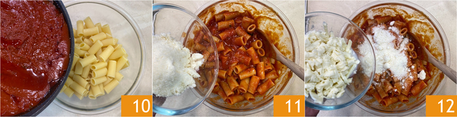 Vierte la salsa en el bol con la pasta 10 y mezcla para condimentarla uniformemente. Añade la mitad del Parmigiano Reggiano rallado 11 y la mitad de la mozzarella desmenuzada 12.