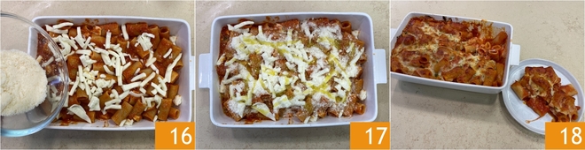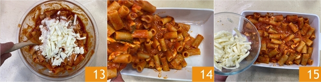 Mezcla bien 13, luego transfiere la pasta así condimentada a una fuente para horno 14. Distribuye sobre la superficie la mozzarella restante 15.