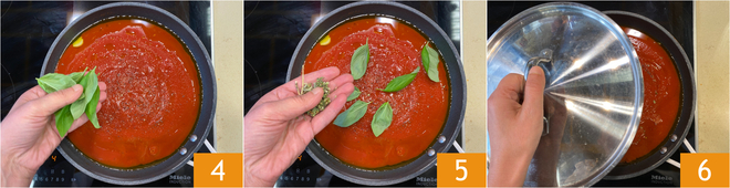 Aromatiza con la albahaca fresca 4 y el orégano seco 5, luego cubre con la tapa 6 y cocina a fuego lento durante unos 30 minutos.