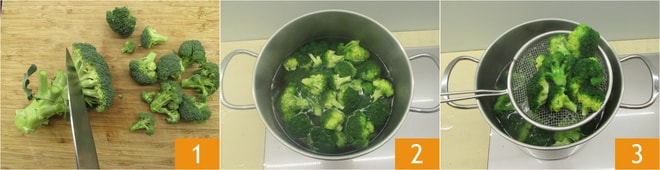 Para realizar la pasta al horno con brócoli y panceta, primero saca las florecillas del tronco 1: después de la limpieza obtendrás aproximadamente 550 g de florecillas (no deseches el tronco: una vez pelado, podrás utilizarlo como se indica al final de la receta). Lava bien las florecillas bajo agua corriente, luego hiérvelas durante unos 5-6 minutos en agua hirviendo 2. Una vez cocidas, escúrrelas y resérvalas, no tires el agua de cocción 3 que servirá para hervir la pasta.