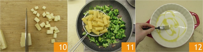 Mientras la pasta se cuece, corta en cubos el Casera 10. Cuando la pasta esté al dente, escúrrela directamente en la sartén con el resto del condimento 11; mezcla para que tome sabor. Apaga el fuego, luego unta con 2 cucharadas de aceite una fuente de unos 30 cm de diámetro 12.