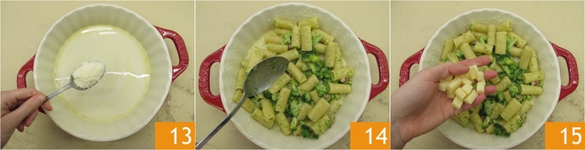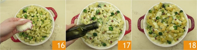 Condimenta la última capa con más Casera, Grana Padano rallado 16 y un chorrito de aceite de oliva 17. Cocina en horno precalentado en modalidad estática a 200° durante 15 minutos en el estante central. Luego gratina durante unos minutos más en modo grill, hasta que esté completamente dorado. Saca la pasta al horno con brócoli y panceta y sírvela bien caliente 18.