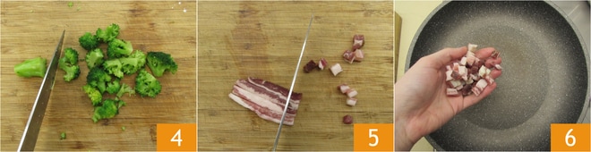 Corta las florecillas en trozos más pequeños 4. Mientras tanto, corta la panceta en cubos 5, calienta una sartén a fuego medio y cuando esté bien caliente añade la panceta 6: saltéala durante unos 10 minutos sin añadir más grasas.