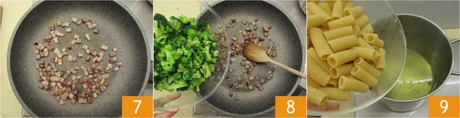 Debe resultar dorada y crujiente 7. Añade aquí también el brócoli 8. Mientras tanto, vuelve a llevar a ebullición el agua en la que has cocido el brócoli, añade sal y cocina la pasta 9, dejando unos minutos menos de lo que indica el paquete.
