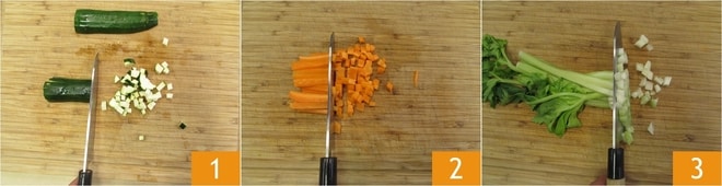 Para preparar la pasta con bechamel de soja, lo primero que hay que hacer es ocuparse de las verduras: lavarlas todas. Corta los extremos del calabacín y córtalo en cubos 1, luego pela la zanahoria y córtala del mismo tamaño 2. También corta en cubos los tallos de apio 3