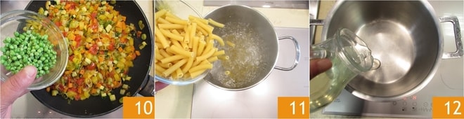 Agrega los guisantes 10 y cocina por otros 2-3 minutos. Mientras tanto, pon a hervir el agua para la pasta, cuando llegue a hervir, añade sal y la pasta 11. Mientras la pasta se cocina, ocúpate de la bechamel. Calienta la leche de soja. En un cazo, vierte el aceite 12