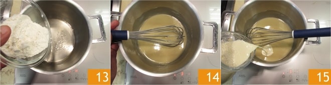 Agrega también la harina 13, mezcla con un batidor y lleva al fuego. Continúa mezclando hasta obtener el clásico roux 14. Vierte la leche caliente poco a poco 15