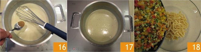 Agrega una pizca de nuez moscada 16 y termina la cocción hasta que espese, continuando a mezclar 17. Escurre la pasta muy al dente y transfiérela a un bol. Vierte las verduras dentro 18.