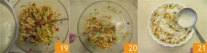 Agrega también la bechamel conservando un par de cucharones 19 y mezcla bien 20. Transfiere a una fuente para horno y añade sobre la superficie la bechamel restante 21.