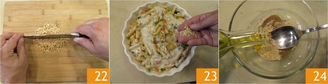 Pica finamente las avellanas 22 y colócalas sobre la pasta 23. Transfiere el pan rallado a un bol y añade un hilo de aceite 24.