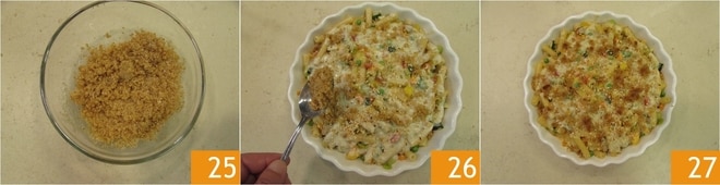 Mezcla bien 25 y espolvorea la mezcla sobre la pasta 26. Gratina durante 5 minutos en el horno precalentado a 240° en modo grill, saca del horno y sirve 27.