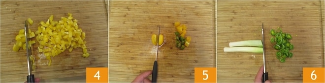 Pasa al pimiento, elimina semillas y filamentos internos, luego córtalo en cubos 4. Toma los tomatitos y córtalos del mismo tamaño 5. Ahora corta el puerro en rodajas 6