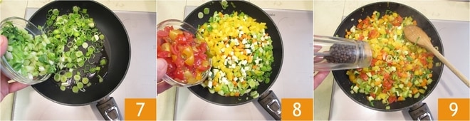 En una sartén grande, vierte un hilo de aceite y el puerro 7. Luego, añade todas las demás verduras, excepto los guisantes 8. Cocina a fuego lento durante 5-6 minutos, luego sala y pimienta 9