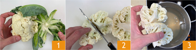 Para preparar la pasta al horno con coliflor vegana, primero prepara el caldo vegetal con nuestra receta. Limpia la coliflor eliminando la base y las hojas 1, luego córtala groseramente 2. Cocina la coliflor en el caldo vegetal durante unos 15 minutos, o hasta que esté tierna 3.