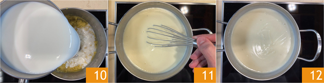 Cuando empiecen a formarse burbujas, añade la leche vegetal caliente 10 y sigue mezclando al fuego 11 hasta obtener una consistencia densa y homogénea 12.
